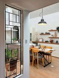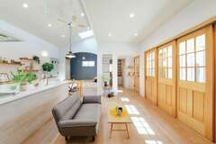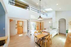 玄関を入った瞬間、開放感あふれる吹抜けの土間が広がるS邸。カフェスタイルでコーディネートされたLDKは、北欧・ブルックリン・カリフォルニアなど、さまざまなテイストがMIXされ、くすみカラーをポイントとして、時間がゆっくりと流れている空間に。リビング南面の引き戸、全開口サッシを開けると庭へとつながり、室内でもアウトドア気分を満喫できる。また、キッチンを起点に回遊しやすい動線にしたことで共働き夫婦の家事時間を短縮。将来、家族で楽しむためのロフトスペースもあり、長く暮らさないと気がつかないような部分に、ハッとするデザインと機能性を加え、『スカイグラウンド』らしい“おもてなしの提案”が随所に見られた。