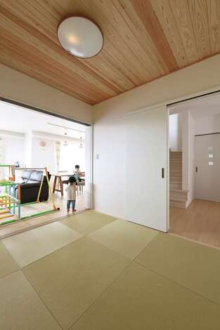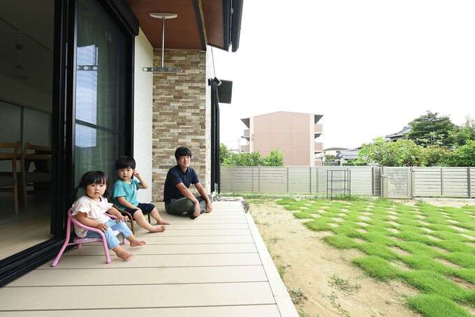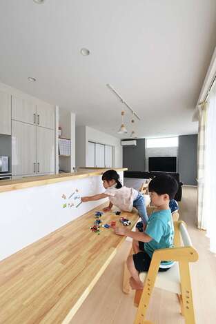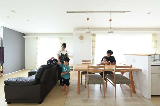 もうすぐ3人目が誕生するKさん。のびのび遊べる広いリビングくさんをイメージしてモデルハウスをた見学したそう。『内田建設』に決めたのは、自由度の高さに惹かれたから。子どもたちが遊ぶ姿を見ながら安心して家事ができるよう、間取りはキッチンを中心に考え、収納もたっぷり確保。「帰宅後すぐお風呂に入り、そのままリビングへ行けるなど、動線も相談したら、内田さんが実現してくれました」とKさん。使い勝手が良く楽しい家になり、大満足のようだ。