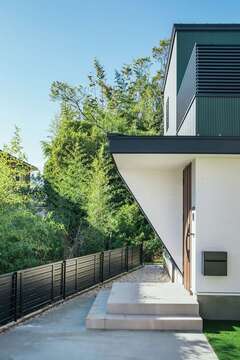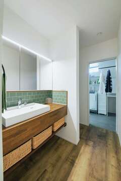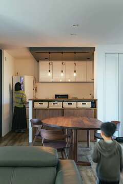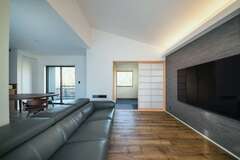 奥さまは地域情報誌のエディターで、普段から工務店を取材する機会も多い。そんな目の肥えたプロがマイホームづくりのパートナーに選んだのが『内田建設』だった。完成した住まいは、北側が山の斜面になっており、視界が開けているため、借景を楽しめるようにテラスを設けた。この贅沢な空間で外からの視線を浴びることなく、BBQや子どもプールなどを楽しめる。勾配天井のLDKは和とモダンが共鳴する心地いい空間で、床暖房対応の塩ビタイルは掃除もラクラク。また、奥さまの取材経験を活かした家事ラク動線や収納計画も無駄がなく時短に貢献している。リモートワーク用の書斎もできて、仕事と家事・子育ての両立がますますしやすくなったと喜んでいる。