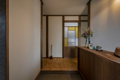 玄関を開けると、オリジナルの引き戸がお迎え。和室の扉と色違いのデザインで統一感を。トイレ