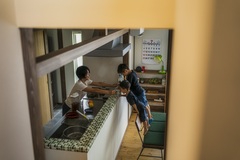 キッチンの笠木には、グリーンのオーダーMIXタイルを。木部との相性も良く、LDKのアクセントに。LDK