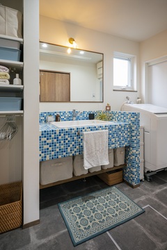 昭和レトロな洗面台を目指して、ブルーのモザイクタイルを採用。書斎