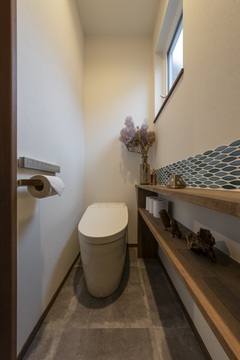トイレも抜かりなく、懐かしいブルーのタイルをセレクト。キッチン