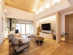 天井が高く、開放的なリビング。照明とインテリアが調和し、くつろげる空間に仕上がっている。リビング