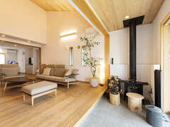 モダンなデザインのリビングには薪ストーブも完備。自然とも調和した心温まる空間が広がる。玄関ホール