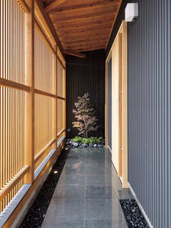 木製の格子と石畳が美しい廊下。自然を感じられる設計で、落ち着いた空間を演出する。この住まいは、和の伝統と現代的な感性を見事に融合させたデザインが特徴である。外観には自然素材を多用し、直線的なラインが目を引く。リビングは天井が高く、余裕のある空間に薪ストーブが暖かみを加え、安らぎを提供する場となっている。また、玄関ホールは木の素材感と柔らかい照明で温かみを感じさせ、家の入口から心を和ませる効果を持つ。廊下には木製の格子と石畳が美しく配置され、伝統とモダンが同居する落ち着いた空間を演出している。45坪の広さを誇るこの住まいは、耐震等級3を取得し、安全性も確保。パッシブデザインにより自然の風を心地よく感じることができる設計となっている。完全自由設計によるこの家は、和モダンの究極形となっている。