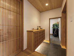 シンプルで温かみのある玄関ホール。木の素材感と柔らかい照明が心地よい雰囲気を醸し出す。廊下