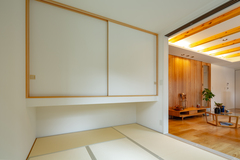 和室とリビングの間を、開閉できる引き戸で仕切ることで、必要に応じて空間を広げたり、プライベートな空間を確保したりできる設計に。開け放てば一体感のある広々とした空間に、閉じれば静けさのある独立した和の空間へ和室