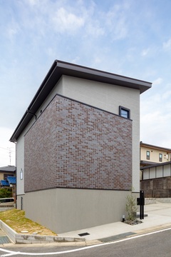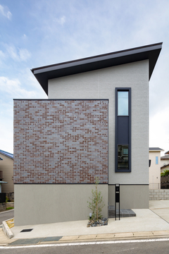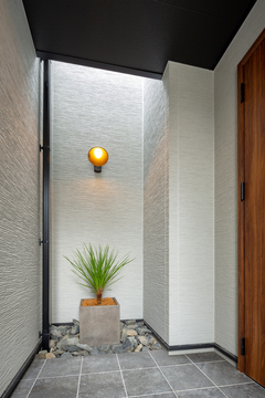 天井に梁を設けたり、間接照明を使うことで、空間に動きを持たせつつ、スッキリとしたモダンな雰囲気に。素焼きタイルの外壁が上品さを醸し出すモダンな外観に仕上げました。タイル壁裏の玄関は広い屋根のアプローチを設け、暗くなりがちな空間を吹気抜けからの明かりで解消。カフェテイストのキッチンには好きなものをデコレーションしてムニカデザインらしさを演出。家を楽しむ、そんな言葉がぴったりな空間に仕上がりました。
