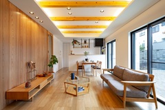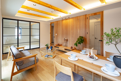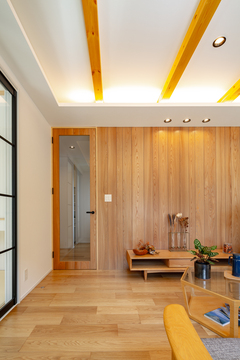 深みのある木材を使うことで、落ち着いた高級感のあるリビングに。間接照明を組み合わせれば、陰影が美しく際立ち、温かみのある空間に仕上がり外観