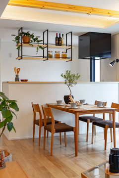 天井から吊るすタイプのアイアンラックを取り入れ、ダイニングの表情がぐっとスタイリッシュに。ラックにはドライフラワーや小さなグリーンを飾ることで、ヴィンテージ感とモダンな雰囲気が融合したインテリアに仕上げられます。リビング
