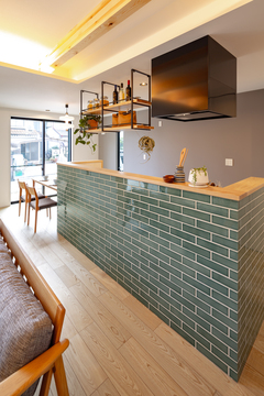 訪れるお客様を驚かせる、グリーンタイルのアイランドキッチンは圧巻。キッチン