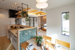 玄関に下駄箱を設置しながら窓も取り入れることで、収納力と採光のバランスを絶妙に調整。機能性だけでなく、空間に開放感と温もりを与える工夫が施されることで、玄関がより心地よい場所へと南側道路の日当たりの良さを最大限に生かせるよう設計しました。訪れるお客様を驚かせる、グリーンタイルのアイランドキッチンは圧巻。庭や玄関ホールまで見えるキッチン配置、和室の扉を開けるとリビングの一部となり家族みんながそれぞれお気に入りの場所でくつろげます。素焼きのグレーのタイルを施工した外壁は、可愛らしさと重厚感のハイブリットな印象に仕上げました。