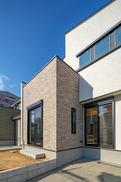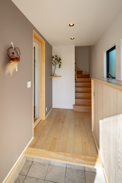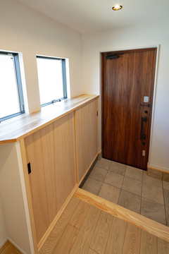 南側道路の日当たりの良さを最大限に生かし素焼きのグレーのタイルを施工した外壁は、可愛らしさと重厚感のハイブリットな印象に仕上げました。玄関ホール