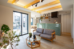 木の温もりだけでなく、タイルと組み合わせることで、洗練されたナチュラルモダンな空間を実現。リビング