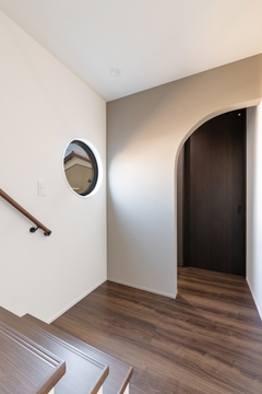木目調のフローリングと丸窓が印象的な廊下。アーチ型のドア開口が空間に柔らかさを与えている。居室