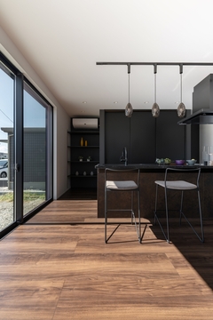 モダンでシックなキッチン空間。広々としたカウンターにはバーチェアが置かれ、開放感のある大きな窓から自然光が差し込む設計となっている。ダイニング