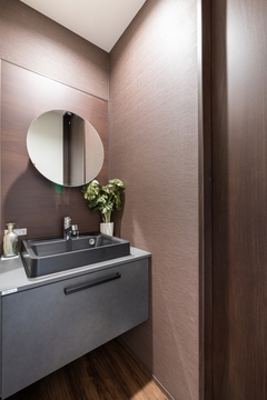 モダンでスタイリッシュな洗面スペース。シンプルなデザインながら、高級感が漂う。丸い鏡と洗練されたシンクが、空間にアクセントを加えている。廊下