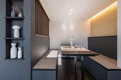 モダンな雰囲気の和モダンスタイルのダイニング。造作のテーブルとスタイリッシュな照明が、食卓をより引き立てる。キッチン