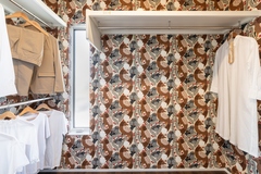 壁紙にマリメッコのデザインを取り入れたウォークインクローゼット。衣類を整理しやすいハンガーレールが豊富で、機能的かつスタイリッシュな空間である。トイレ