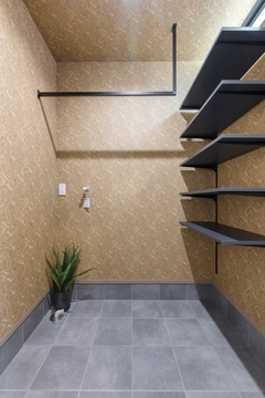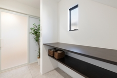 シンプルなデザインの土間空間。壁に取り付けられた複数の棚は収納にも便利。キッチン
