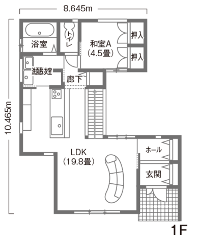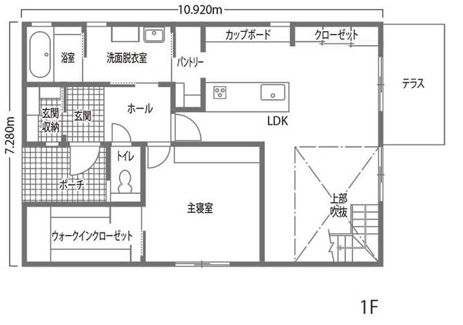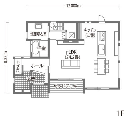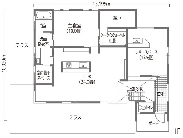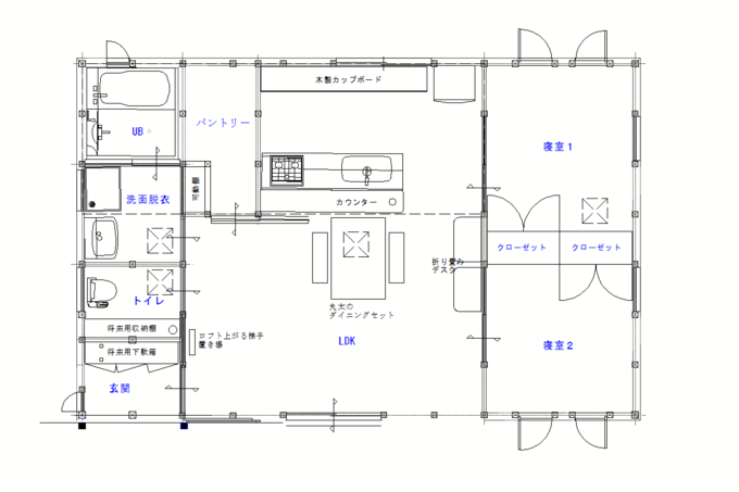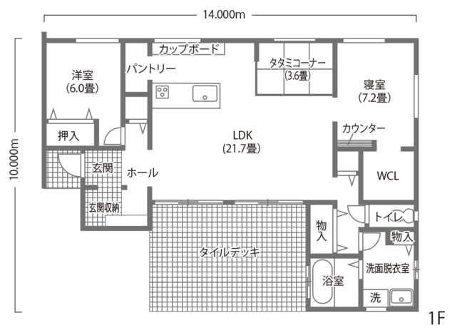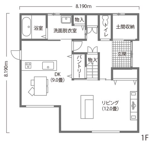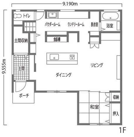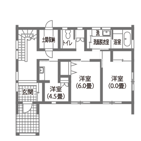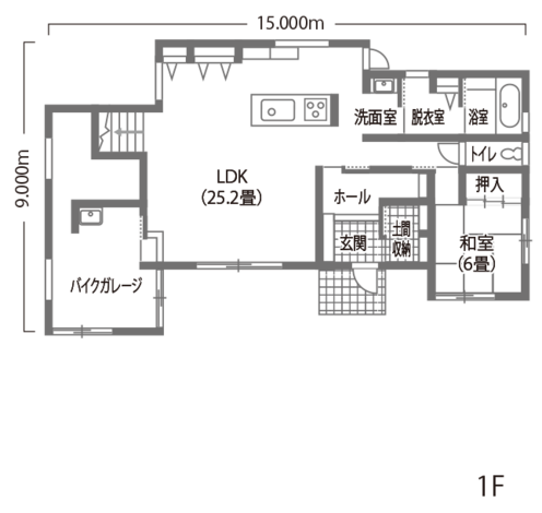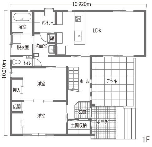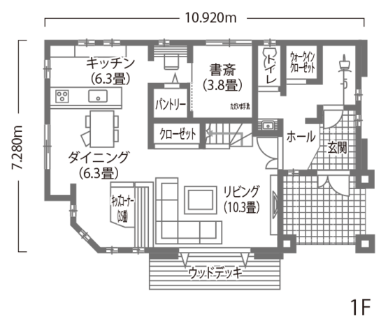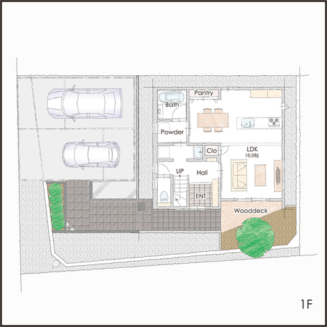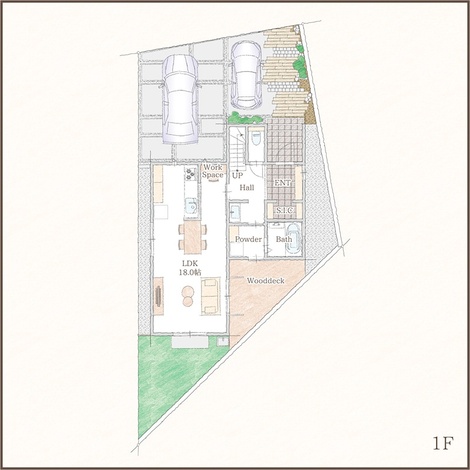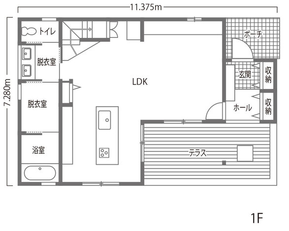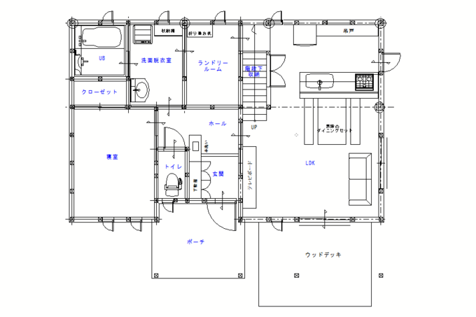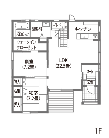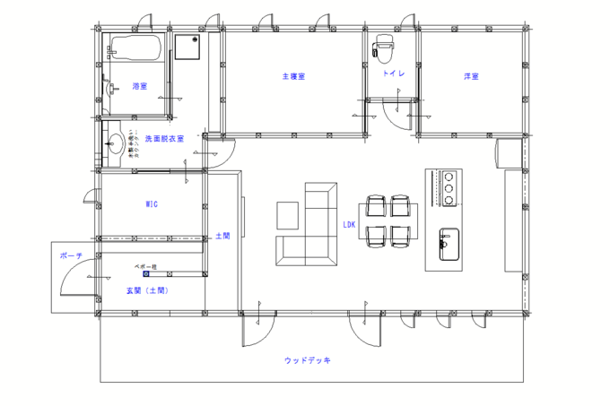 土間スペースとウッドデッキでアウトドア感を楽しむ 2LDK 梁の見えるLDKにアイランドキッチンは お施主様のご希望が叶ったプラン 玄関にはシンボル柱を配置し、 収納スペースと入口動線と仕切っています。 土間に向かうスタイルでソファとテレビを 配置しているので、のんびりくつろげます。 2つの洋室の他にWICを設け荷物をすっきり収納、 リビングの散らかりを防ぎます。 DIYが趣味のお施主様ご夫婦の 暮らしを楽しむ間取りになりました。