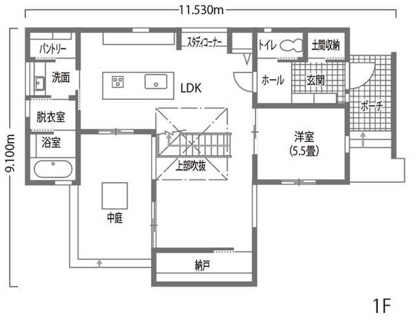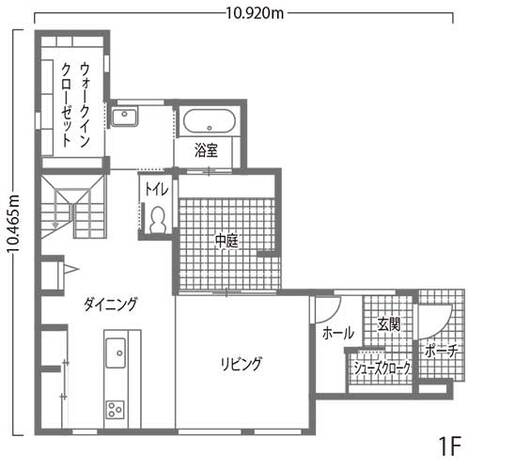視線を遮りつつ、プライベートな中庭を囲むコの字型の家。リビングから吹抜けを見上げた時に見える空が開放感を演出してくれます。