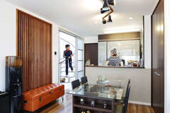 住宅街で、周囲の目が気にならない開放的なテラスをリビングに併設したことにより、LDKがより広く感じられるようになりました。