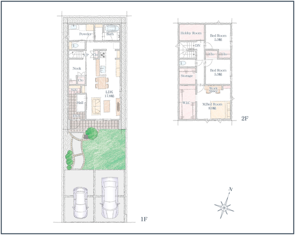 1階は、18帖の広々としたLDKとウッドデッキがつながり、家の中と外がゆるやかにひとつにつながる開放的な空間に。リビングに隣接するワークスペースは、趣味やリモートワークに活躍します。キッチンを中心とした効率的な家事動線も、忙しい毎日をサポート。 2階には、8帖の主寝室と2つの子ども部屋を配置。さらに、家族みんなで使える大容量のウォークインクローゼットも完備し、収納力と快適さを両立しています。 ナチュラルな素材感と光の入り方にこだわり、日々の暮らしにやさしく寄り添う空間に仕上げました。