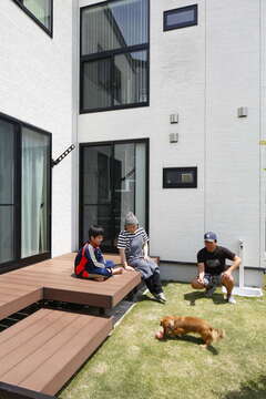 約30畳のLDKと広い庭で、家族がのびやかに暮らす家