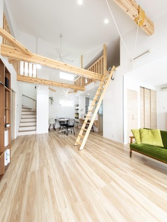 開放感のあるLDK空間。ロフトへと続くはしごや、木の温もりを感じられる梁が印象的で、モダンなデザインに仕上がっている。LDK