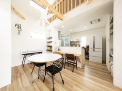 お客様も使う1階トイレは、0.75坪と広めにした。引き戸なのでストレスなく使える。この住宅は、シンプルでモダンなデザインが魅力的な二階建てである。白い外壁が清潔で、広々としたバルコニーが外観のアクセントとなっている。リビングから続くスキップフロアは、ロフトへのアクセスをスムーズにし、天井の高い開放的な空間を演出している。木の温もりを感じられる梁や木材が、モダンなデザインにナチュラルな要素を加えている。フリースペースやダイニングにも自然素材がふんだんに使われ、家族みんなが落ち着ける温かさに満ちている。また、明るい木目調のキッチンや機能的な洗面スペースが、毎日の生活を快適にサポートしてくる。家族3人が心地よく過ごせる、完全自由設計の住まいである。建築家による設計が活かされた一棟は、家族の時間を豊かに彩る空間へと昇華している。