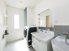 洗面脱衣室は1.5坪の大きめのサイズにし、スロップシンクを付けた。子供のの洗い物に便利な上、洗面台が混雑した時に重宝する。玄関ホール