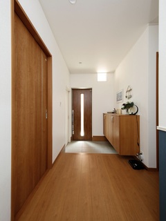 木製の床材とシンプルなインテリアが調和した玄関ホールは事務所と居住スペース。玄関扉はベビーカーがそのまま入れるように引き戸を採用。寝室
