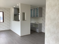 シンプルで広々としたLDKスペース。壁でキッチンとダイニングエリアを分けることで、プライバシーを確保しつつも開放感を意識したデザインになっている。キッチン