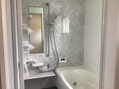 シンプルで機能的なバスルーム。壁面のグレーの模様が落ち着いた雰囲気を醸し出し、洗練されたデザインが魅力的である。ウォークインクローゼット