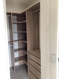 木目調で統一されたウォークインクローゼット。多様な収納スペースが設けられており、衣類や小物を効率的に整理できる。玄関