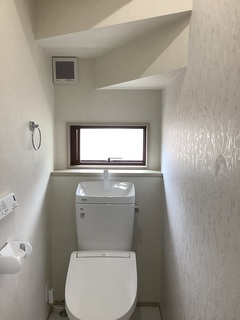 シンプルで機能的なトイレ空間。窓から自然光が入り、明るく清潔感のあるインテリアが特徴で、快適に使用できるスペース。バスルーム
