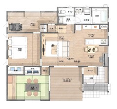 土間リビングでペットと一緒に心地よく暮らせる間取りです。窓から軒のあるウッドデッキ、そして庭へとつながる設計で、自然と調和したくつろぎの空間が仕上がりました。家事ラクな動線やすっきり隠せる収納、家相に考慮した作りなど、家族みんなが快適過ごせる住まいです。