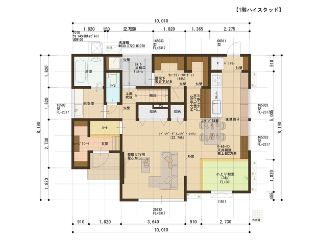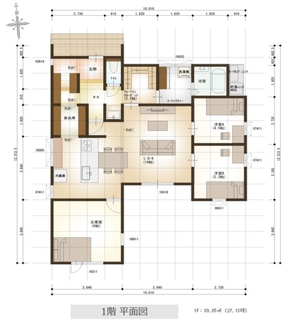 2階建ての3LDKは、ゆったりとくつろげるリビングや豊富な収納スペースを特徴としています。リビングは上質な時間を過ごすための大空間であり、ゲストを招く際も快適な空間を提供します。また、回遊導線を意識した配置や小上がりの畳スペースなど、使い勝手の良さも兼ね備えています。パントリーや土間収納などの収納スペースは整理整頓をサポートし、暮らしを快適にします。施主の要望を踏まえた設計は、上質な暮らしを演出し、心地良いライフスタイルを実現します。