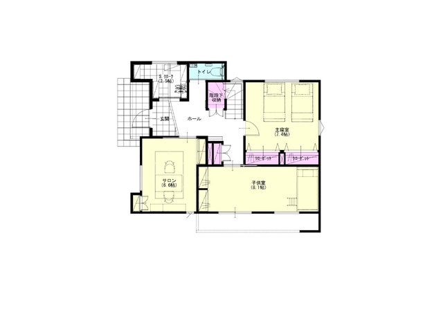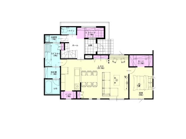 開放感あふれるリビングを中心に、家族が自然と集まる間取り。 広々としたキッチンとダイニングが一体となっており、家族の団らんを大切にした設計です。 3つのベッドルームは程よい距離感でプライバシーも確保。 収納力のあるウォークインクローゼットや洗面脱衣室も完備され、暮らしやすさを重視した機能的な動線です。 また、玄関ホールから水回りへのアクセスもスムーズで、来客時にもプライベート空間をしっかり守れます。
