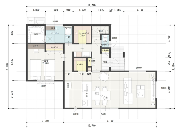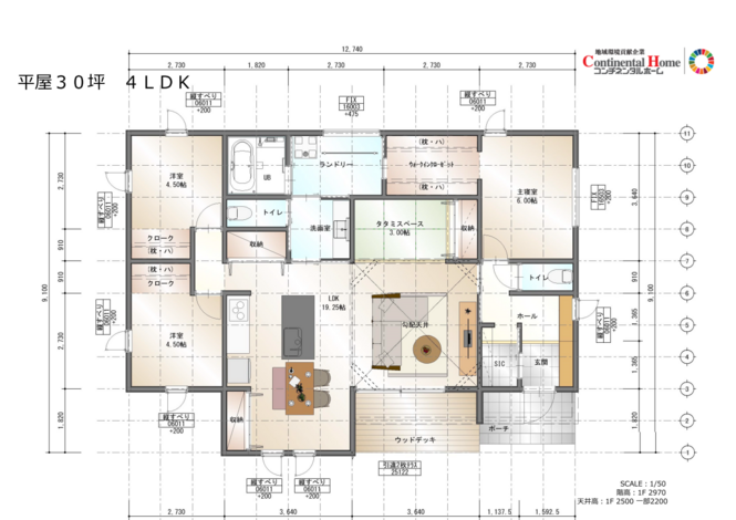 この平屋4LDKの間取りは、家事効率性とくつろぎの両立を追求したものです。ファミリークローゼットや豊富な収納スペースが整理整頓をサポートし、回遊導線が自然な移動を促します。リビングでは広々とした空間でゆったりとくつろげる一方、ランドリールームやタタミコーナーが日常の使い勝手を向上させます。施主の要望を踏まえ、家族みんなが快適に過ごせる生活を提案しています。