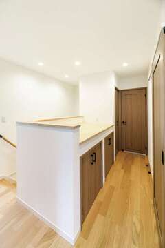 小回りが利くのが弊社の強みです。家中のニッチやR垂れ壁も一つずつカーブを確認しながら理想の形に。造作カウンターや収納家具の木材にも統一感を持たせ美しく仕上げました。